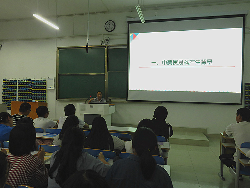 盛正国首先从中美贸易战产生的背景与原因出发,简明扼要的介绍了中美贸易战的发展历史,他指出2003年至2005年岁末,由美国单方面挑起的一系列贸易摩擦给中美贸易关系蒙上了浓重的阴影,贸易大战似乎一触即发,中美两国进入了前所未有的贸易摩擦期。近年来,随着中美经贸关系的快速发展,双边贸易摩擦也呈现日益加剧的趋势,2018年,特朗普政府不顾中方劝阻,执意发动贸易战,掀起了又一轮的中美贸易争端。其次,他还谈及中美贸易战的关涉领域,贸易争端主要发生在两个方面:一是中国具有比较优势的出口领域;二是中国没有优势的进口和技术知识领域。最后,在提到中美贸易战的中美双方的具体影响时,他也指出了中国政府的应对策略。让学生了解当今局势不仅关系到个人的发展更关系到整个民族的复兴。学生们认真做好笔记,并表示受益匪浅。