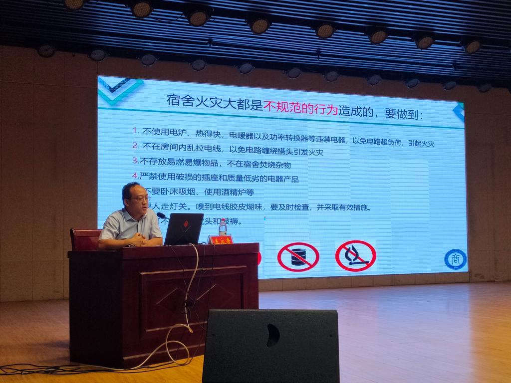 紧接着,王永贵老师为新生开展了一场精彩绝伦的入学教育系列讲座---校园安全篇。他针对大学生如何保护自己的人身、财产、生活、网络、心理安全,一一进行详细地讲解。同时,他还利用一些实际案例,指出高校学生安全工作的紧迫性和必要性,让在座的每一位新生都受益匪浅。