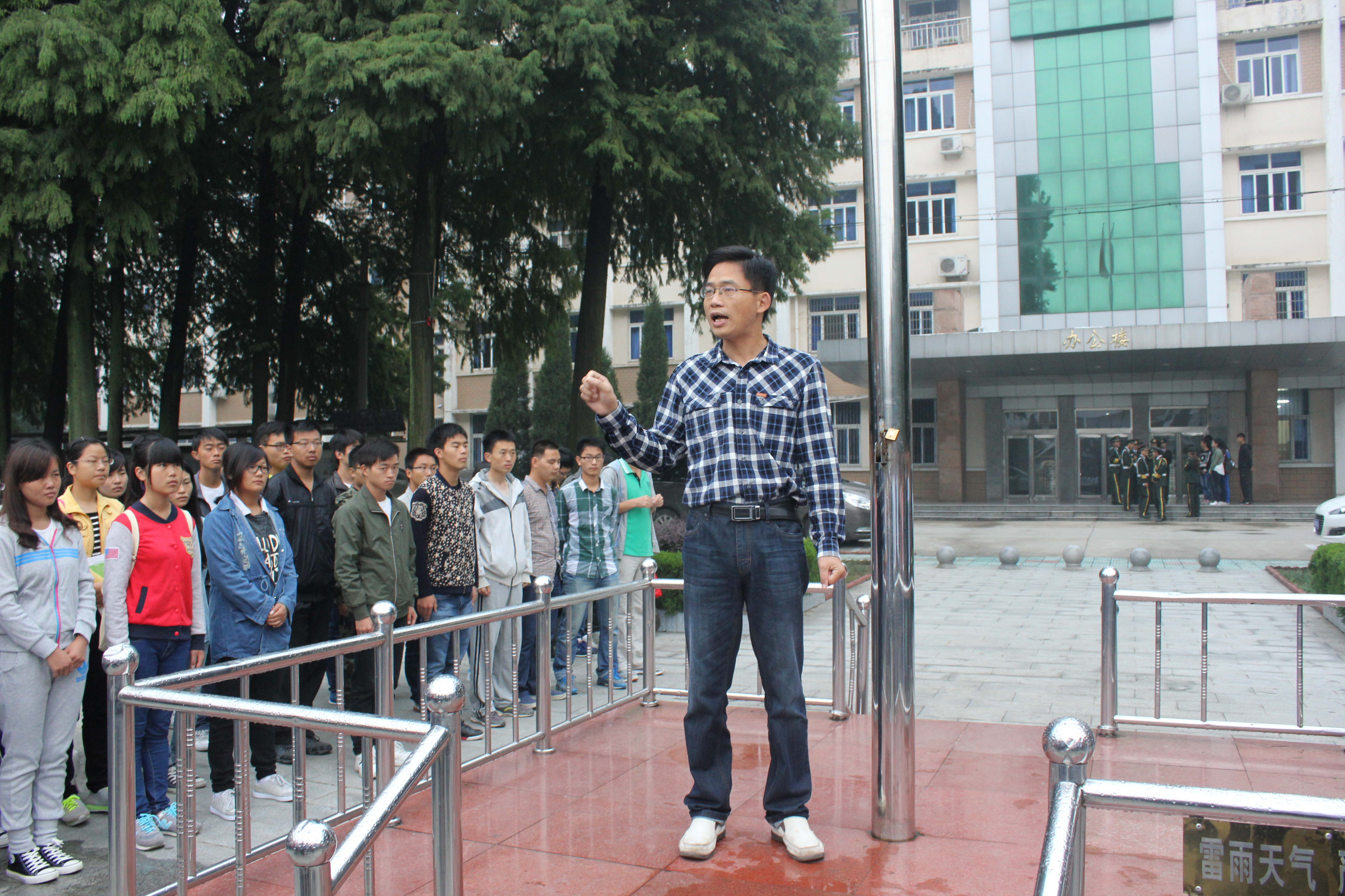 9月27日上午8时,经济学院学生干部在校团委的带领下步行前往红军广场,同学们冒雨前行,历经一个小时的路程来到了鄂豫皖革命纪念馆。