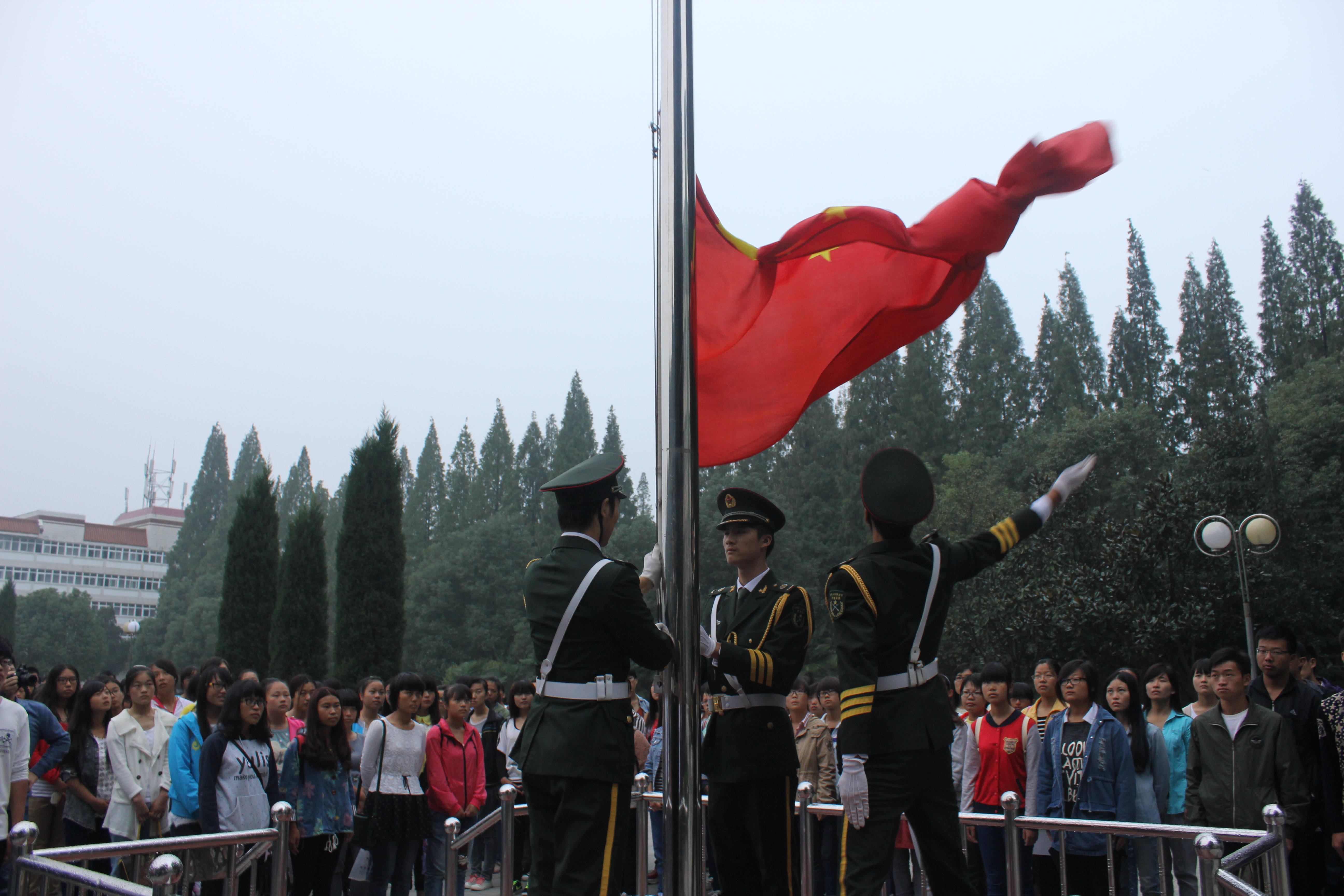 不少学生早早就等候在国旗台前,6点10分活动在主持人的深情朗诵中拉开帷幕。活动中全体师生与国旗合影,注目并仰望国旗徐徐升起;面向国旗宣誓,振臂高呼时代口号;在“缅怀革命先烈、喜迎祖国华诞、共筑中国梦”条幅上留言签字。在面对国旗宣誓环节,同学们表情严肃、语言铿锵有力,誓言不忘先烈丰功伟绩,积极担起青春使命。在面对国旗高呼时代口号环节,房书记先与大家一起回顾了1840年鸦片战争特别是1937年全面抗战以来,在挽救民族危亡的历程中,无数仁人志士坚守“祖国不亡,有我!”的时代誓言,为国家和民族抛头颅洒热血;他指出新时代我们仍在冒着敌人的炮火前进,应该铭记“祖国的繁荣富强我负责”这一属于当今青年学子的时代口号,并带领师生振臂三呼“祖国的繁荣富强我负责”,声音响彻校园上空。