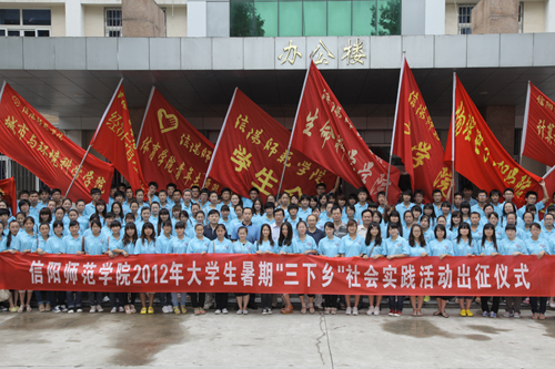 为贯彻落实胡锦涛总书记在庆祝建团90周年大会上的重要讲话精神和教育部等部门《关于进一步加强高校实践育人工作的若干意见》精神,充分发挥社会实践作为加强和改进青年学生思想政治教育重要途径的优势,促进青年学生向实践学习、向人民群众学习。 7月1日下午,信阳师范学院2012年大学生暑期社会实践活动出征仪式于该校明德广场隆重举行。该院党委副书记余作斌出席仪式并讲话,党委宣传部、学生工作部、校团委等部门负责人出席了仪式。